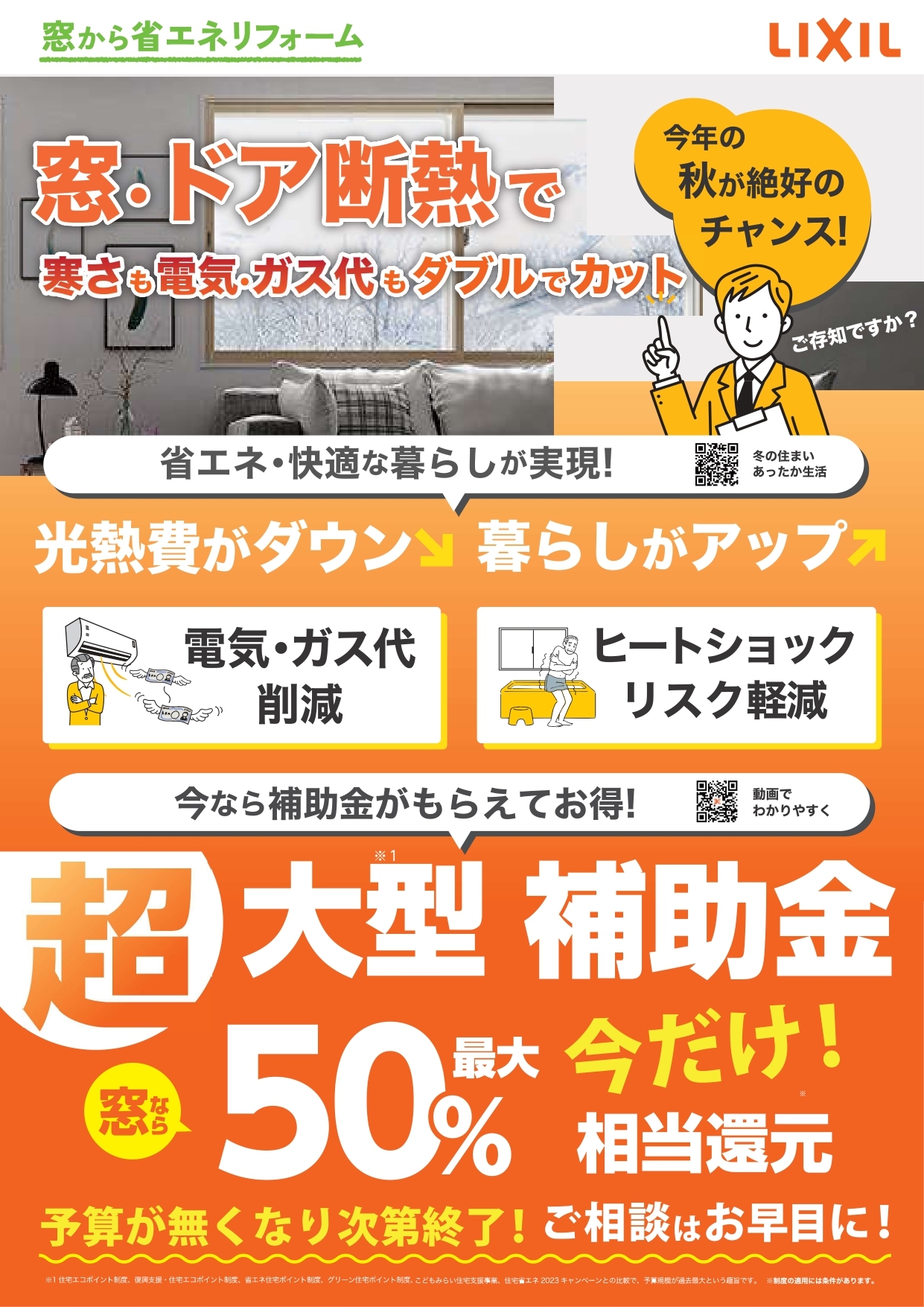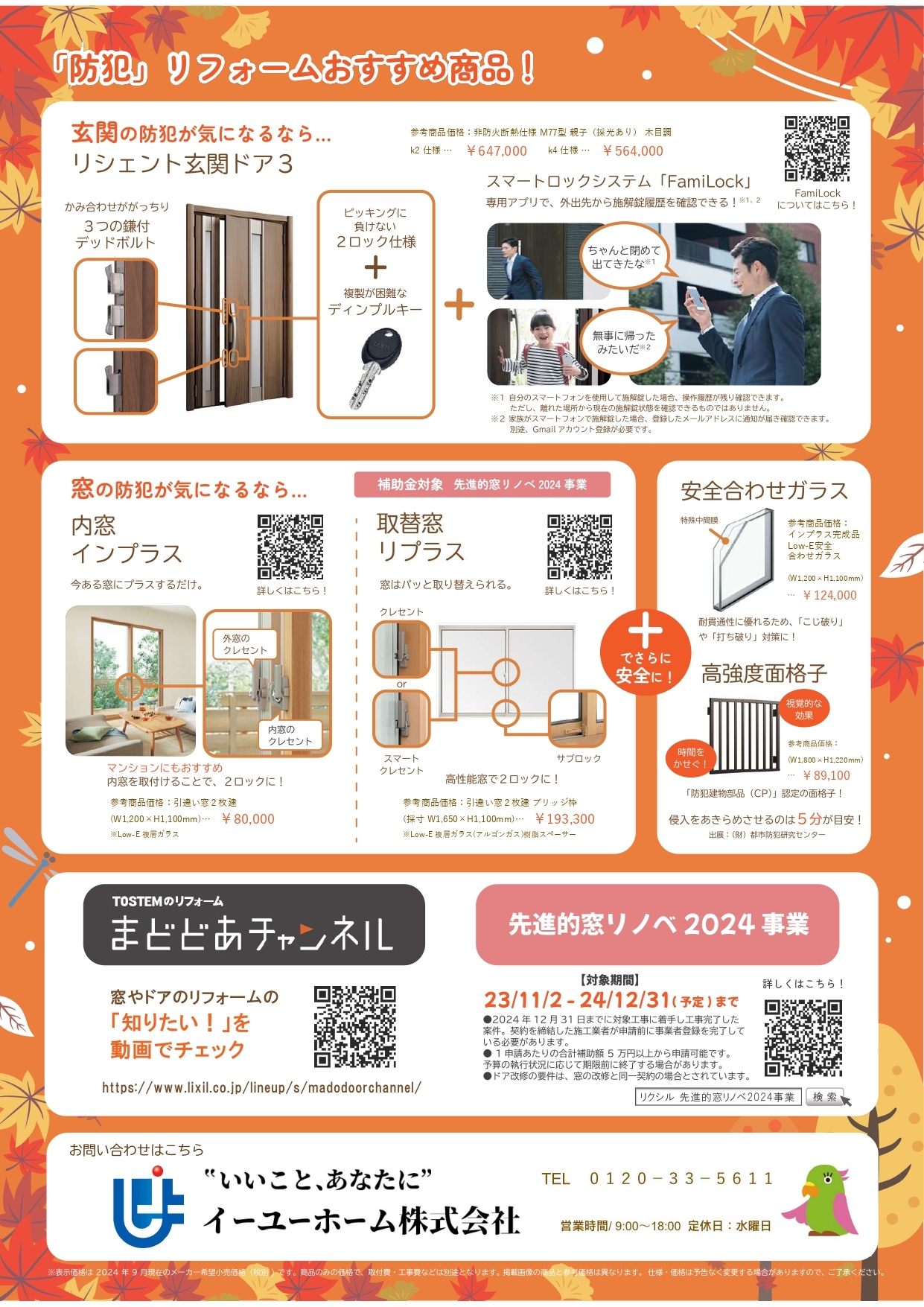 防犯において大切なのはやはり窓です!中でも今お勧めしたいのが「内窓リフォーム」!2重になる事によって安心なのはもちろんのこと、断熱性もあり、これからの冬暖かく過ごせます♪(夏は涼しいです!)さらに今なら「窓リノベ補助金」で補助金が戻ってくるのでダブルと言わずトリプル以上でお得なんです!ぜひこの機会にお考え下さい。