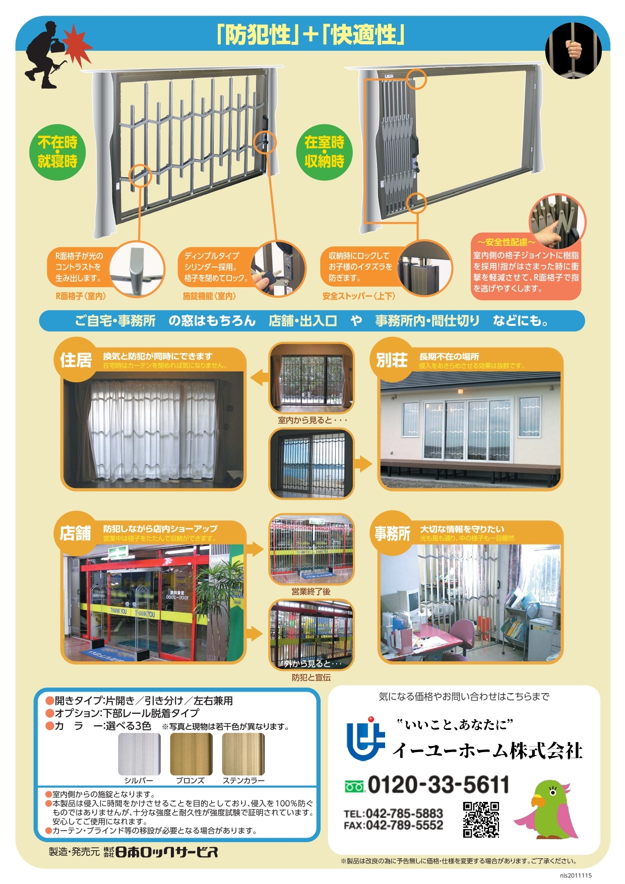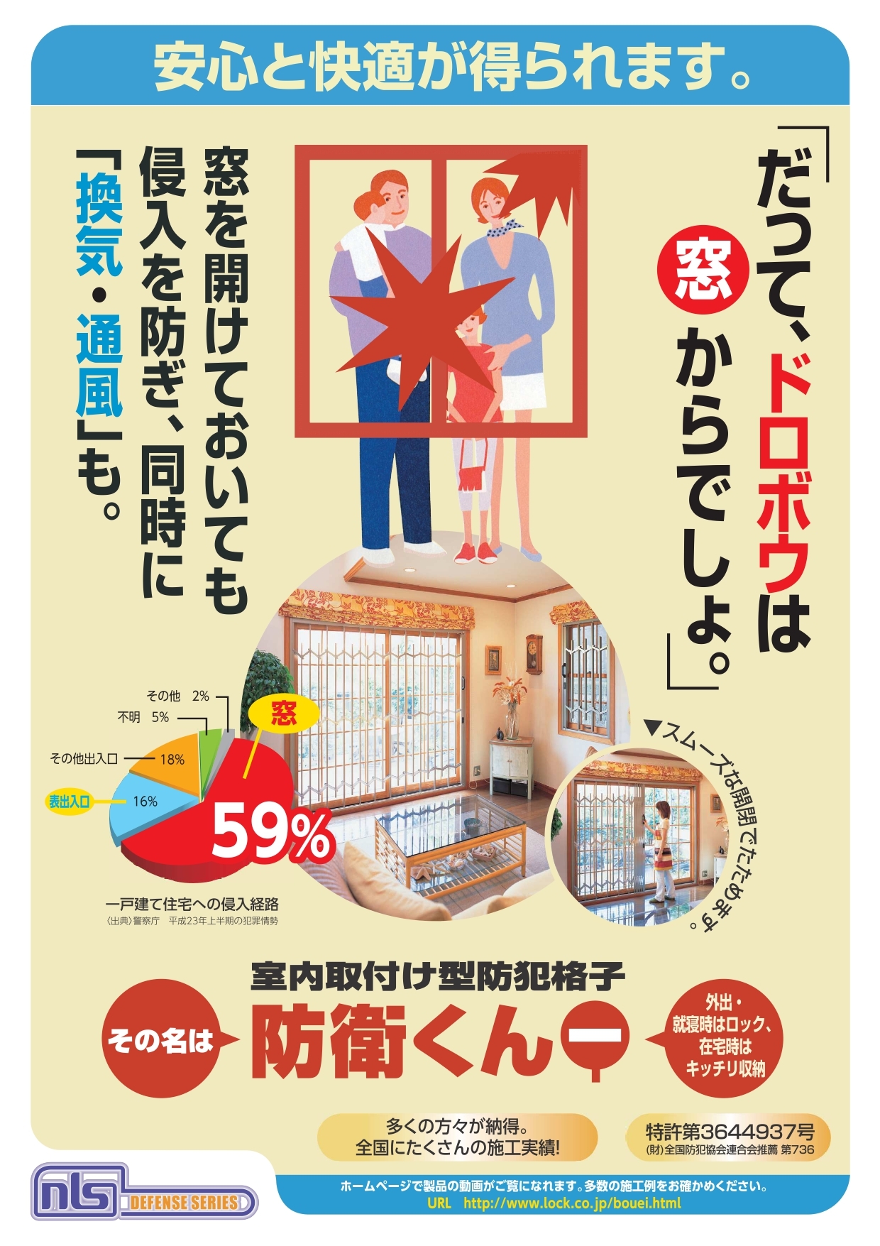 「窓を開けて換気したいけど不用心で心配・・・」という方に心強い味方「防衛くん」があります!室内取り付け型の防犯格子なのですが、開閉できるので、必要ない時には収納でき外観を損ねません。ご自宅の他、店舗や事務所、また間仕切りなどにも使える重宝物です!