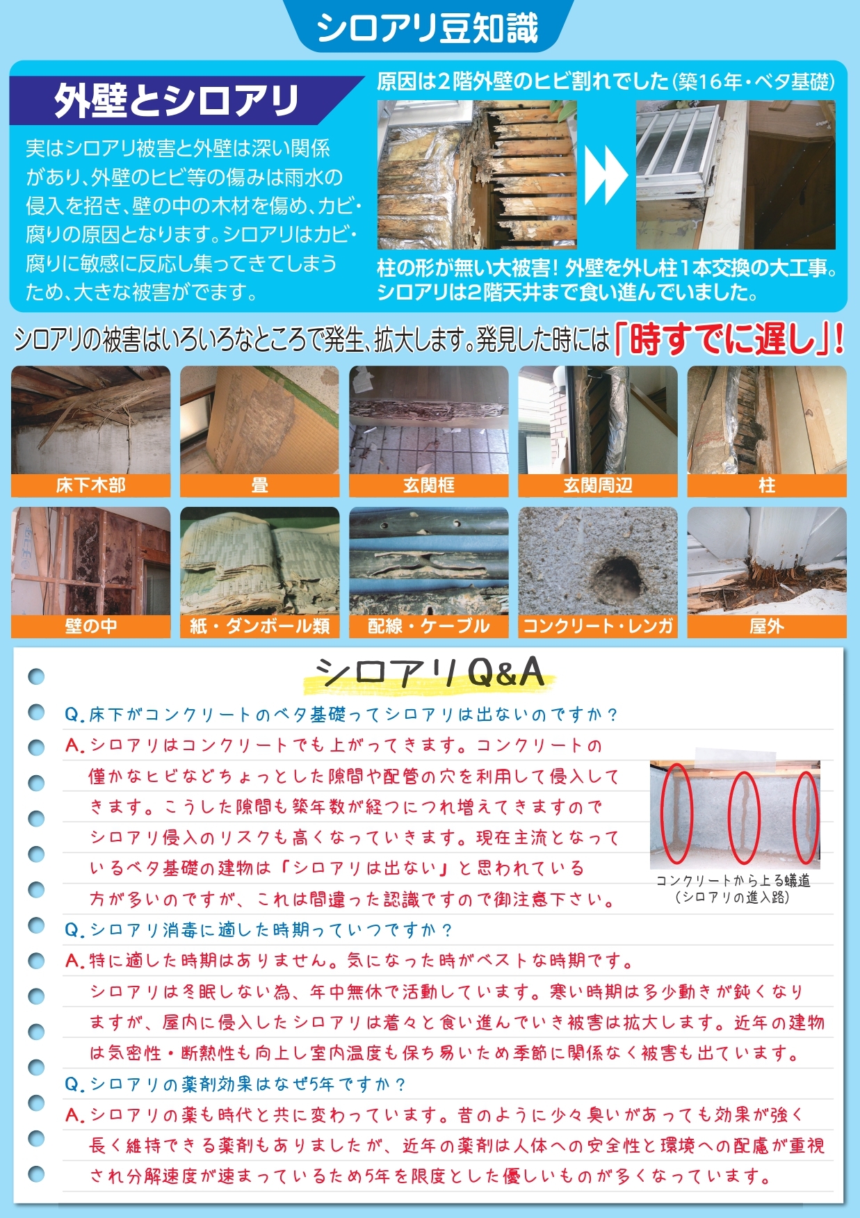 もしも、シロアリの被害があった場合には早期駆除を!協会の施工基準に則り、安全性の高い認定薬剤を使い施工し、5年間の保証付きで暮らしに安全・安心をお届けします。